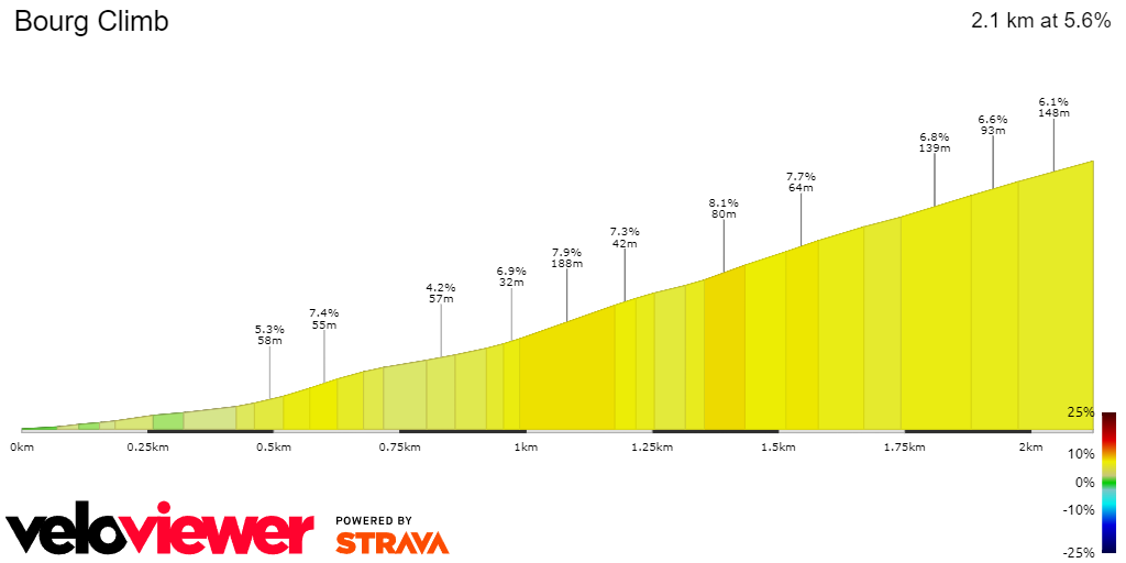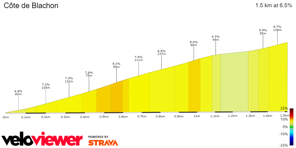 Pas assez proche de l'arrivée, les côtes de Blachon (1.5 kilomètre à 6.9 %) et de Simacourbe (1.8 kilomètre à 6.4 %) ne joueront aucun rôle d'élimination des adversaires les plus lourds.